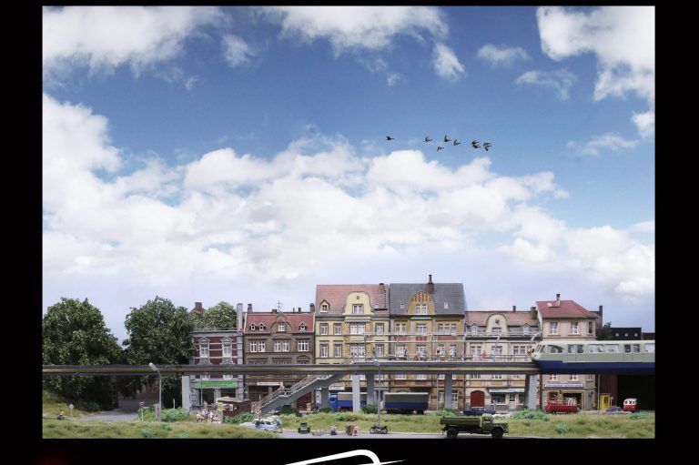 Die Alweg – Bahn hat ihre passende Hintergrundkulisse erhalten und wirkt optisch schon hervorragend. Nun kommt nur noch der Leuchtrahmen hinzu. Rein fahrtechnisch sind die Arbeiten bereits abgeschlossen. Hier harmoniert die Alweg – Bahn mit dem Faller-Car-System und ferngesteuerten Autos im Maßstab 1:87